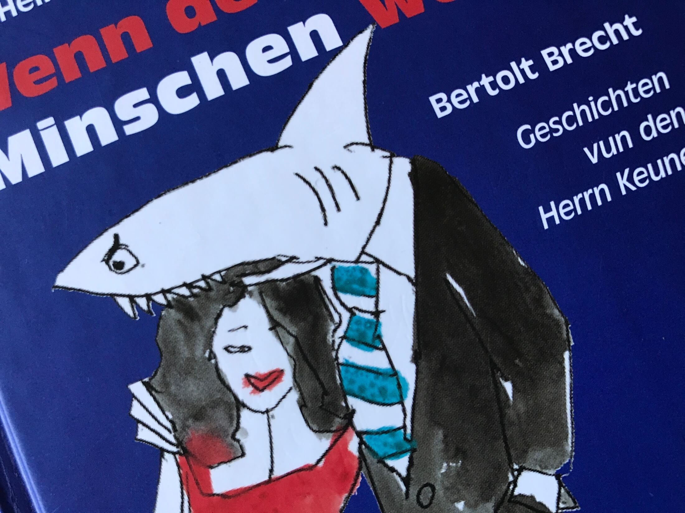 De Parabel „Wenn De Haifische Minschen weern“ is je, as annere „Keuner“ -Geschichten för vele Schöler as mi fröher ok, Plichtlektüüre ween. Sach- und Bedüüdensebenen interpreteeren, dorto en Düütschklausur schrieven, dorbi kann denn ok gau mal de Lust un dat Interesse an düssen groten Dichter verschütt gahn. Ümso interessanter is dat, wenn een Johrteinte later, düt Book in de Hannen kriggt un denn noch in twee Spraken!